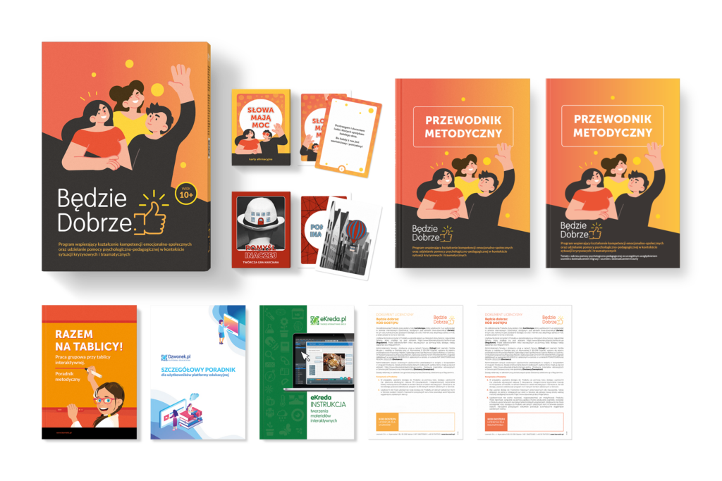 Główną częścią programu Będzie dobrze są interaktywne ekrany i multimedialne plansze. Jednak to nie wszystko! W pudełku użytkownicy znajdą także podręczniki metodyczne, dwa zestawy autorskich kart do gier i zabaw, karty pracy oraz scenariusze zajęć.